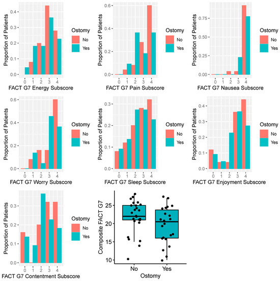 Distributions of PROs are summarized in Table 1, with results stratified by presence of an ostomy. Composite and subscore distributions of the FACT G7 score are displayed in Figure 1. Overall, individuals with an ostomy reported numerically worse FACT G7 composite scores, although differences were not statistically significant (p = 0.12). There were no differences in FACTG7 scores by sex (mean score for females and males were 20.7 and 20.6, respectively; p = 0.8). Sexual (IIEF, FSFI) and urinary-related (MLUTS, FLUTS) PROs are summarized in Supplemental Figure S1, with results stratified by ostomy status. Composite IIEF and FSFI were numerically greater (indicating better sexual function) for men and women without an ostomy, although results were not significantly different (p = 0.18 and 0.83, respectively). MLUTS and FLUTS scores were higher for men and women with an ostomy (p = 0.06 and 0.01, respectively), indicative of worse urinary symptoms.