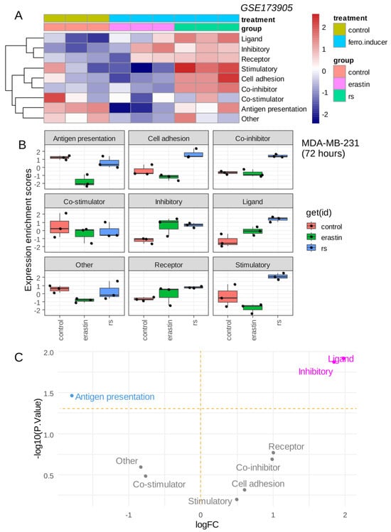 Ferroptosis inducers up-regulated inhibitory immune checkpoints in triple negative breast cancer cells: (A) Heatmap of immune modulation scores computed on transcriptome of MDA-MB-231 cells stimulated during 72 h with ferroptosis inducers: erastin and RSL3 (rs); (B) Boxplot of immune modulation scores computed on transcriptome of MDA-MB-231 cells stimulated during 72 h with ferroptosis inducers: erastin and RSL3 (rs); (C) Volcanoplot testing regulation of immune modulation scores computed on transcriptome of MDA-MB-231 cells stimulated or not during 72 h with ferroptosis inducers.