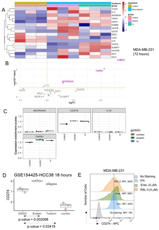 The expression of inhibitory immune checkpoints was investigated in the same transcriptome dataset, and both ferroptosis inducers were shown to induce the significant overexpression of CD274, TGFB1 and ADORA2A (Figure 3A,B), with an especially marked overexpression of CD274 (Figure 3B,C). The expression of immune receptors [] in MDA-MB-231 stimulated by erastin and RSL3 was also investigated. These analyses did not show any major significant regulation of immune receptors in MDA-MB-231 after stimulation with ferroptosis inducers (Supplemental Figure S1).