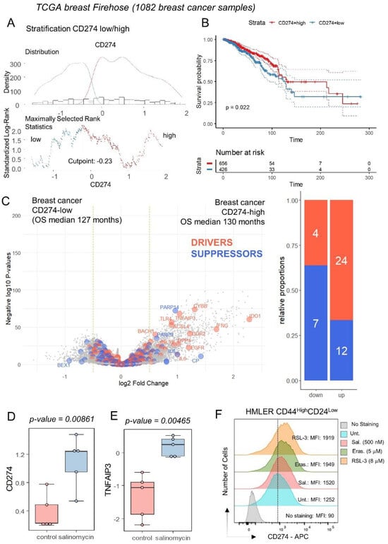 Breast tumors of patients with longer survival conjointly overexpressed CD274 and ferroptosis drivers: (A) Optimal threshold for CD274 expression according to overall survival of the patient from Firehose TCGA invasive breast cancer transcriptome cohort (n = 1082 tumors); (B) Kaplan Meier and log rank test for breast cancer TCGA cohort according to overall survival outcome and stratification on CD274 expression groups; (C) Volcanoplot and barplot of ferroptosis actors (FerrDbV2: drivers in orange and suppressor in blue) regulated between breast tumors according to their low or high level of CD274 expression; (D) Protein expression of CD274 by breast cancer stem cell under salinomycin stimulation; (E) Protein expression of TNFAIP3 by breast cancer stem cell under salinomycin stimulation. (F) Expression of CD274 by flow cytometry analysis in HMLER CD44highCD24low under ferroptosis inducer treatments (48 h): erastin, RSL3, and salinomycin. MFI: mean of fluorescence intensity.