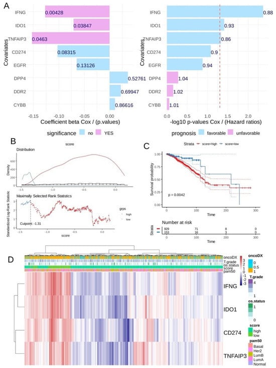 Loops of univariate overall survival analyses against expression of immune marker (CD274) and ferroptosis drivers were computed with “loopcolcox” R-package (version 1.0.1) available at the following web address: https://github.com/cdesterke/loopcolcox, accessed on 22 November 2023). For each significant marker (univariate Cox p-value ≤ 0.1), Cox beta coefficients were extracted to compute an expression score comprising CD274 and 3 ferroptosis drivers: TNFAIP3, IFNG and IDO1. This score is based on the following equation: