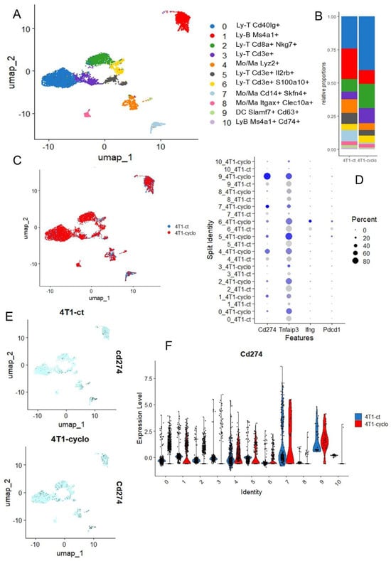 Single cell transcriptome of infiltrated microenvironment in 4T1 transplanted tumor after cyclophosphamide treatment: (A) UMAP dimension reduction with cell cluster identification; (B) Cell cluster proportion according to experimental conditions; (C) UMAP dimension reduction stratified on experimental conditions: CT (untreated control), CYCLO (cyclophosphamide treatment); (D) Dotplot of single cell expression for Cd274, Tnfaip3, Ifng and Pdcd1 across the distinct cell cluster and experimental conditions, color scale from grey to blue: level of expression; (E) Featureplot of Cd274 expression stratified on experimental conditions; (F) Violinplot of Cd274 expression across cell clusters and split on experimental conditions.