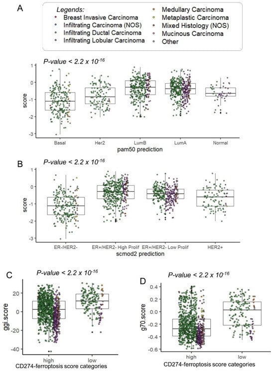 In the TCGA transcriptome cohort, patients with a lower CD274 ferroptosis-driver score were confirmed to be in the basal and Her2 subtypes (Figure 7A). In the basal and Her2 subgroups, a high expression was observed for CD274, IFNG and IDO1 (Supplemental Figure S3). A high expression of TNFAIP3 was observed only in basal and normal-like subgroups (Supplemental Figure S3). Concerning the SCMOD2 classifier, a low level of CD274 ferroptosis-driver score was observed in the ER-/Her2- group (Figure 7B). Interestingly, this CD274 ferroptosis-driver score was found significantly associated to distinct prognostic scores. Patients with low score harbored higher values of Genomic Grade Index (ggi) (p-value < 2.2 × 10−16, Figure 7C and Table 2), higher values of the OncotypeDx score (p-value < 2.2 × 10−16, Figure 7D, Supplemental Figure S4A and Table 2) and higher values of the gene70 score (p-value < 0.0001, Table 2).