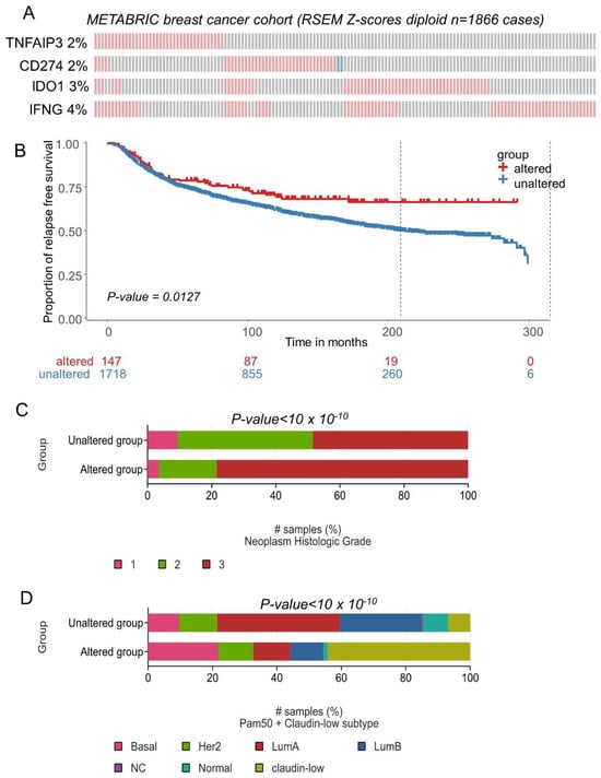 The expression of CD274, IFNG, TNFAIP3 and IDO1 was investigated in an independent cohort of the transcriptome: METABRIC cohort comprising 1866 breast tumors. The majority of transcriptional alterations observed for these markers concerned upregulation, with a frequency superior or equal to 2 percent of the tumors (Figure 8A). Relapse-free survival patients presenting combined transcriptional alterations for these four markers presented a significantly longer survival time during the follow-up (log rank test p = 0.0127, Figure 8B). In terms of tumor grade for this validation cohort, a significant increase in tumor stage 3 was found associated in the group of patients affected by transcriptional alterations in these four genes (p-value < 10 × 10−10, Figure 8C). Patients affected by transcriptional alterations in these four genes presented a significant increase in basal and claudin-low subgroups (p-value < 10 × 10−10, Figure 8D). A higher expression of CD274 was found in the TNBC subgroup of the METABRIC cohort, as compared to other breast cancer samples (p-value = 1.25 × 10−10, Supplemental Figure S5A). A higher expression of IDO1 was found in the TNBC subgroup of the METABRIC cohort, as compared to other breast cancer samples (p-value < 2.2 × 10−16, Supplemental Figure S5B). A higher expression of IFNG was found in the TNBC subgroup of the METABRIC cohort, as compared to other breast cancer samples (p-value < 2.2 × 10−16, Supplemental Figure S5C). A higher expression of TNFAIP3 was found in the TNBC subgroup of the METABRIC cohort, as compared to other breast cancer samples (p-value < 2.2 × 10−16, Supplemental Figure S5D).