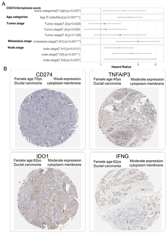 CD274 ferroptosis-driver score is independent prognostic marker in breast cancer: (A) Forest plot of multivariable Cox model with overall survival as outcome (TCGA cohort) and included CD274-ferroptosis score with other covariates such as age categories (threshold 65 yo), and TNM (Tumor, Nodes, Metastasis) classification, *: 0.01 ≤ p < 0.05, **: 0.001 ≤ p < 0.01, ***: p < 0.001, color points are representative of each covariate; (B) Representative detection at protein level (immunohistochemistry) in breast tumors for molecules included in computation of CD274-ferroptosis driver score: (low magnification).