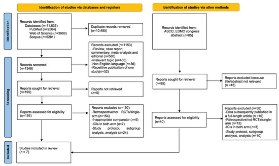 Our systematic search retrieved a total of 11,833 records. After removing the duplications (n = 10,485), we removed 1153 records after the title and abstract search. After evaluating the full texts of the remaining 195 articles, 190 records were excluded for the following reasons and a total of 6 studies were retrieved from the systematic search. One additional study and an additional survival update were identified from the search of ASCO and ESMO congresses, making a total of seven studies included in the analyses. The flowchart for study selection is demonstrated in Figure 1.