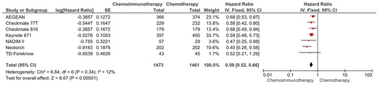 In the pooled analysis of seven studies, the use of neoadjuvant chemoimmunotherapy was associated with a 41% reduction in the risk of progression or death compared to neoadjuvant chemotherapy (HR: 0.59, 95% CI: 0.52–0.66, p < 0.0001) (Figure 2). The included studies had a low degree of heterogeneity (I2 = 12%), and the sensitivity analyses conducted by the subtraction of the individual studies demonstrated a consistent benefit with immunotherapy.