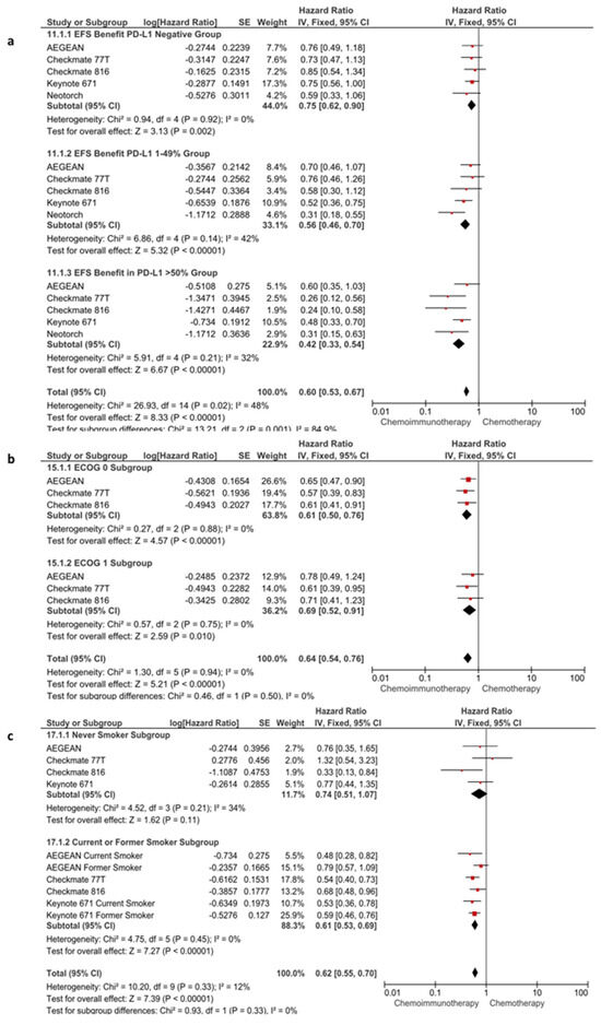 The meta-analysis was performed using the generic inverse-variance method with a fixed-effects model, considering the low degree of heterogeneity across all analyses. The primary objective was to compare the EFS between the patients treated with neoadjuvant chemoimmunotherapy versus chemotherapy. In addition to comparing the EFS with chemoimmunotherapy and chemotherapy, subgroup analyses for EFS according to PD-L1 expression, smoking status, age, disease stage, and ECOG performance status were conducted. The secondary objectives were to compare the OS, pathological complete response rate (pCR), R0 resection rate, and all-grade and high-grade (grade 3 or higher) adverse events between patients treated with neoadjuvant chemoimmunotherapy versus chemotherapy. The principal summary measure were the HRs with 95% two-sided CIs for EFS and OS, and odds ratio (OR) and 95% two-sided CIs for adverse events, pCR, and R0 resection rates. All analyses were conducted using the Review Manager software, version 5.4 (The Nordic Cochrane Center, The Cochrane Collaboration, Copenhagen, Denmark). The heterogeneity within each subgroup was assessed using Higgins I-square statistics. A p-value below 0.05 was considered statistically significant.