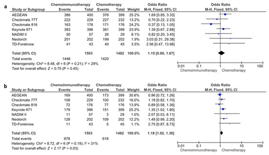 The data regarding the pCR and R0 resection rates were available in all seven of the included studies. In the pooled analysis of seven studies, the use of chemoimmunotherapy was associated with significantly higher pCR rates compared to chemotherapy (21.8% vs. 3.8%, OR: 7.04, 95% CI: 5.23–9.47, p < 0.0001) (Figure S4). The R0 resection rates were also improved with chemoimmunotherapy compared to chemotherapy (OR: 1.63, 95% CI: 1.24–2.14, p = 0.0005) (Figure S5). In the pooled data of seven studies, all-grade adverse events were similar in patients treated with chemoimmunotherapy (96.2%) and with chemotherapy (95.8%) (OR: 1.15, 95% CI: 0.80–1.67, p = 0.4500) (Figure 5a). However, the high-grade (grade 3 or higher) adverse events were higher with chemoimmunotherapy (45.1%) than with chemotherapy (41.7%) (OR: 1.18, 95% CI: 1.02–1.36, p = 0.0300) (Figure 5b). Although there was a trend towards lower pneumonectomy rates in patients treated with chemoimmunotherapy, the difference did not reach statistical significance (OR: 0.76, 95% CI: 0.57–1.00, p = 0.0500) (Figure S6). All analyses had a low degree of heterogeneity (I2 < 50% for all).