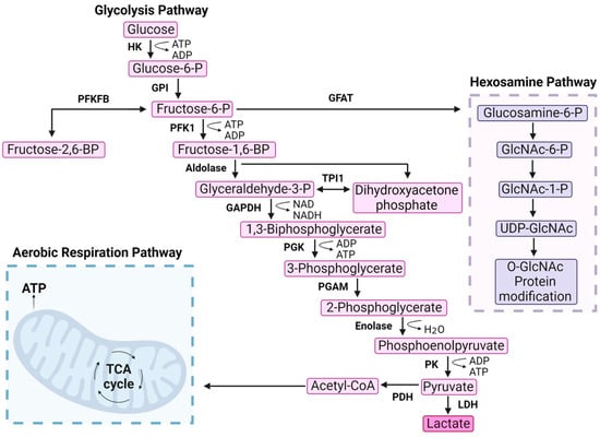 Several PFK1 PTMs that occur in physiologic conditions are hijacked to promote cancer cell metabolism. In ovarian cancer, S-nitrosylation has also been reported to promote PFK1 activity by creating resistance to negative feedback regulators []. Hypoxia leads to PFK1 serine 529 modification with O-GlcNAcylation, which inhibits enzymatic activity and redirects glucose flux into the pentose phosphate pathway to promote growth in multiple solid tumor cancer cell lines, including breast, prostate, liver, colon, and cervical cells (Table 2) []. Blocking the O-GlcNAcylation of PFK1 reduced cancer cell proliferation in vitro and decreased tumorigenesis in vivo []. In these cases, cancer cell growth was enabled by PFK1 inhibition by shunting metabolites into the pentose phosphate pathway to generate nucleic acids for rapid proliferation while also contributing to the prevention of oxidative stress in cancer microenvironments [,] (Figure 1).