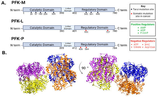 Phosphofructokinase-1 isoforms and regulation. (A) There are three PFK1 isoforms that each have three distinct domains. PFK-M and PFK-L are 780 amino acids long, while PFK-P is 784 amino acids long. PFK-M is the only isoform to contain mutation sites involved in Tarui disease, denoted by black triangles below PFK-M. Red arrows denote reported cancer-related mutations in PFK-L and PFK-P discussed in the text. All three isoforms respond to the listed regulators, although some isoforms are more sensitive to certain regulators than others. [H+] indicates an increase in protons or acidity as a PFK1 negative regulator. Fructose-2,6-bisphosphate (F-2,6-BP). (B) Representative images of PFK1 structure from different angles (90-degree rotation) taken from protein database entry 4XYK with subunits color-coded using UCSF Chimera Software. Each of the four PFK1subunits are depicted in a different color (blue, orange, yellow, and purple).