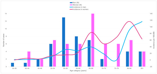 Figure 1 shows that between 2005 and 2014, the specific crude incidence was very low in both sexes before age 50 (less than six cases per 100,000) and then increased with a peak at 65–69 years (39.5 for men and 83.2 for women). After declining from age 70 in both populations, the incidence started to rise again, reaching 116.4 and 90 in women and men aged 80 to 84 years, respectively. After 84 years, it continued to grow in the male population, while it decreased in the female population.