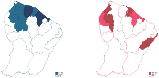 In women (Figure 2), at the regional level during this decade, the standardized incidence rates were zero for more than half of the municipalities of French Guiana (Awala-Yalimapo, Camopi, Grand-Santi, Iracoubo, Mana, Maripasoula, Montsinéry-Tonnegrande, Ouanary, Papaïchton, Régina, Roura, and Saint-Elie), and the maximum rate was observed for Saint-Laurent-du-Maroni (West) at 11.2 per 100,000 woman-years.