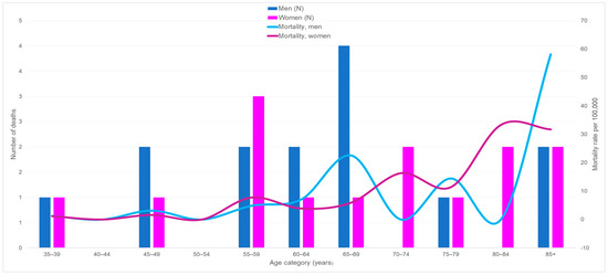 Figure 3 shows the number of deaths from PC and MM by age group and mortality rates per 100,000. Throughout the decade, mortality seemed to increase among women. Among men, it declined from 2.2 per 100,000 in 2005–2009 to 1.5 per 100,000 in 2010–2014; among women it increased from 1.04 per 100,000 in 2005–2009 to 1.9 per 100,000 in 2010–2014. Of 23 deaths with available information, nine deceased persons (39.1%) were foreign born.