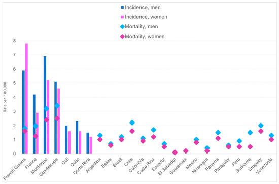 Figure 4 shows international comparisons for incidence and mortality. The highest incidence was in French Guiana, and the inversion of the usual higher incidence and mortality in men was a notable feature. Despite this high incidence, mortality was similar to that of France and lower than in Martinique and Guadeloupe.