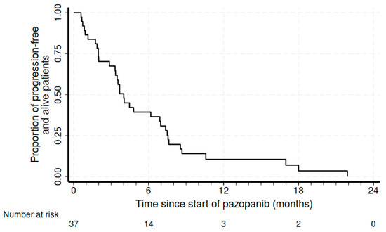 Regarding safety, grade 3 toxicities were rare (no grade 4 AEs occurred). Each grade 3 toxicity had an incidence of less than 5%, considering the whole study sample: the drug resulted overall as safe for the patients and easily manageable for clinicians. To date, the safety profile in this study is in line with that reported in the drug characteristics of the product (e.g., hepatic toxicity), with no suspected adverse reactions to report. Patients in PR presented a high rate of grade 3 AEs (50%) with two complicated events that could also be from tumor shrinkage due to responses (intestinal perforation and pneumothorax). Nevertheless, the grade and type of AEs were consistent with the known safety profile of pazopanib [14,15,16,17,18,19,20]. In addition, our rate of discontinuation rate due to AEs was 5.2%, lower than that reported in the literature, i.e., about 13% [21,22].
