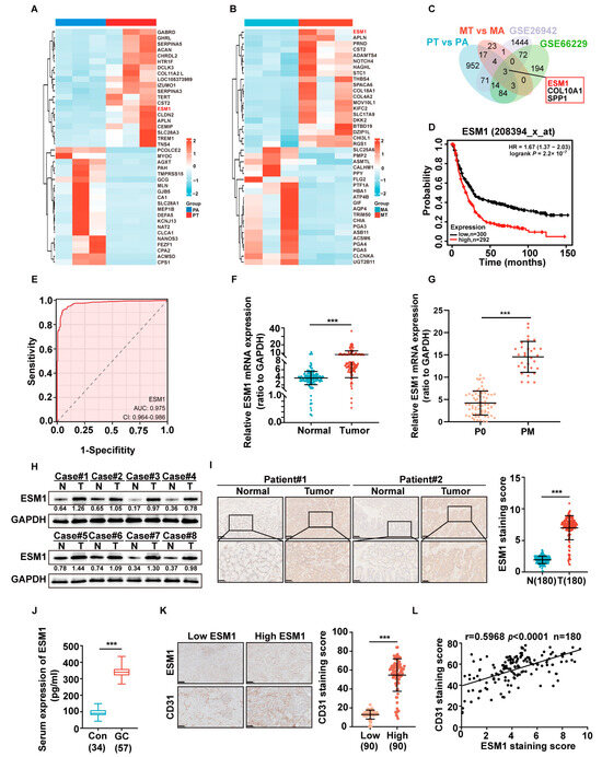 ESM1 is up-regulated in primary and metastatic GC tissues and is positively correlated with tumor angiogenesis in GC. The heatmap mainly indicates the expression levels of 20 differential up-regulated and down-regulated genes in primary gastric cancer (A) and metastatic gastric cancer (B), relative to adjacent tissues. (C) A Venn plot represents the three overlapped up-regulated genes. (D) A KaplanMeier plot of OS for GC samples in the KM plot database. (E) ROC curve analysis of the sensitivity and specificity of ESM1 in the diagnosis of gastric cancer patients (AUC = 0.975, p < 0.05). (F) RT-qPCR analysis of ESM1 mRNA expression in 77 pairs of gastric cancer patient specimens. Data are presented as the mean ± SD of triplicate independent sets of experiments. Statistical significance was assessed by a paired t-test, *** < 0.001, n = 77. (G) RT-qPCR analysis of ESM1 mRNA expression in 71 gastric cancer patient specimens without PM and 30 gastric cancer patient specimens with PM. Data are presented as the mean ± SD of triplicate independent sets of experiments. Statistical significance was assessed by a paired t-test, *** < 0.001, n = 71. (H) A Western blot analysis was performed on eight pairs of GC patient samples using an antibody against ESM1. The uncropped blots are shown in Supplementary Materials Figure S5C. (I) IHC staining was performed using an antibody against ESM1 and representative photographs of ESM1 in 180 GC patients. Scale bar: 100 μm. The right is the IHC stain scoring of ESM1. Statistical significance was assessed by an unpaired t-test, *** < 0.001. (J) A Serum ELISA assay of 34 normal people and 57 GC patients revealed that ESM1 was highly expressed in GC patients’ serum compared with normal people. Con: control group; GC: gastric cancer patients. Statistical significance was assessed by an unpaired t-test, *** < 0.001. (K) IHC staining was performed using antibodies against ESM1 and CD31, and representative photographs of CD31 in 180 GC tissues with a high and low ESM1 expression. Scale bar: 100 μm. The right includes the IHC staining scores of CD31. Statistical significance was assessed by a paired t-test, *** < 0.001. (L) A correlation analysis of the staining index of the protein expression levels of ESM1 and CD31 in GC specimens (n = 180). The correlation coefficient is shown. The data represent the means ± SEM, *** < 0.001.