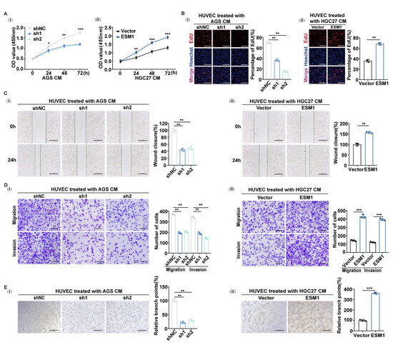 To investigate the effect of ESM1 secreted by gastric cancer cells on endothelial cells, we treated endothelial cells with gastric cancer cell culture supernatant to detect the effect on their functional behaviors. The CCK8 and EDU array showed that the proliferation ability of HUVECs treated with the supernatant of AGS-shESM1-1 and AGS-shESM1-2 could be inhibited compared with the control cell supernatant (Figure 2(A-i,B-i)), while the proliferation of HUVECs treated with the supernatant of HGC27-ESM1 could be enhanced compared with the control group (Figure 2(A-ii,B-ii)). Moreover, the wound healing assay showed that the migratory ability of HUVECs was inhibited when treated with the supernatant of AGS-shESM1-1 or AGS-shESM1-2 (Figure 2(C-i)). When treated with the supernatant of HGC27-ESM1, the migratory ability was increased (Figure 2(C-ii)). A Transwell assay further revealed that HUVECs migration and invasion slowed down when treated with the supernatant of AGS-shESM1-1 and AGS-shESM1-2 (Figure 2(D-i)), while they increased when treated with the supernatant of HGC27-ESM1 (Figure 2(D-ii)). The tube formation assay showed that ESM1 could promote tube formation. HUVECs treated with AGS-shESM1-1/AGS-shESM1-2 cell supernatant showed less tube formation (Figure 2(E-i)), while HUVECs treated with HGC27-ESM1 cell supernatant showed more tube formation compared with the negative control group (Figure 2(E-ii)). The cell supernatant is a collection of cytokines; therefore, in order to clarify the function of ESM1, we added recombinant ESM1 to the supernatant of the HGC27-vector or added neutralizing antibody against ESM1 to the supernatant of AGS-shNC and then treated the HUVECs. All these cellular functions could be rescued, as shown in Figure S3A–E.