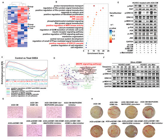 ESM1 promotes angiogenesis through the MAPK/ERK signaling pathway. (A–D) RNA sequencing (RNA-seq) was performed on HUVECs treated with the CM obtained from GC cells in the presence or absence of a neutralizing antibody against ESM1. (A) Heatmap of significantly differential genes. (B,C) The gene set enrichment analysis of gene ontology performed using the cluster Profiler R package based on differential genes. (B). Bubble chart of the top 20 enriched GO biological processes processed using ggplot2 R package. (C) Enrichment map of specific GO sets of interest. (D) GO enrichment network analysis performed with cluego, a Cytoscape plug-in based on significantly differential genes. (E) The protein expression of HUVECs treated with the CM obtained from AGS-shESM1 cells in the presence or absence of recombinant ESM1 or c-Met-inhibitor; AGS cells in the presence or absence of a neutralizing antibody against ESM1 or the c-Met-inhibitor detected using Western blot with indicated antibodies. The uncropped blots are shown in Supplementary Materials Figure S5E. (F) The protein expression in HUVEC-shNC and HUVEC-shc-Met cells treated with recombinant ESM1 at 0, 10, 20, 30, 40, and 60 min detected using a Western blot with indicated antibodies. The uncropped blots are shown in Supplementary Materials Figure S5E. (G) The Tube formation of HUVECs treated with the CM obtained from AGS-shESM1 cells in the presence or absence of recombinant ESM1, MAPK/ERK inhibitor or c-Met-inhibitor, AGS cells in the presence or absence of neutralizing antibody against ESM1, MAPK/ERK stimulator, or MAPK/ERK-inhibitor Scale bar: 200 µm. (H) The results of the CAM assay performed using embryonated chicken eggs treated with the CM obtained from AGS-shESM1 cells in the presence or absence of recombinant ESM1, MAPK/ERK inhibitor, or c-Met-inhibitor, AGS cells in the presence or absence of neutralizing antibody against ESM1, MAPK/ERK stimulator or MAPK/ERK-inhibitor. The inner diameter of the sampling rings was 8 mm.