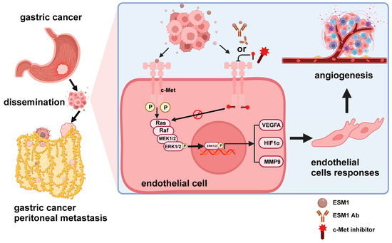 In conclusion, ESM1 expression is increased during the peritoneal metastasis of gastric cancer. ESM1 can activate the downstream MAPK/ERK signaling pathway by binding to the c-Met membrane receptor of vascular endothelial cells and can promote the expression of HIF1α, VEGFA, MMP9, and other pro-angiogenic factors, thereby promoting tumor angiogenesis and peritoneal metastasis.