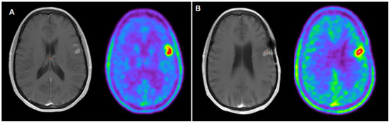 In a Bayesian network meta-analysis including different PET radiotracers and MRI for recurrent glioma, 18F-FET showed the highest sensitivity, specificity, positive predictive value, and accuracy [4]. However, when a simultaneous imaging of 18F-FET PET and MRI obtained by a hybrid PET–MRI system comes into play, no significant differences seem to exist, probably explained by an increase in the interpretation confidence of both joined techniques [28,29].