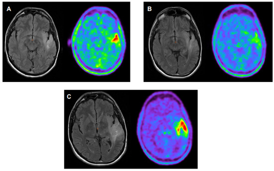 45-year-old male diagnosed with a grade II glioma by stereotactic biopsy. Preoperative MRI (FLAIR) and 18F-FET PET (A) showed an increased radiotracer uptake in a non-contrast-enhanced lesion on the left temporal lobe, with a TBRmax and mean of 2.4 and 2.0, respectively. Therapy with temozolomide and additional radiotherapy was administered. (B) Control MRI showed a stable disease with signs of a partial response to 18F-FET PET (TBRmax and TBRmean of 1.0 and 0.9, respectively). Following MRI was suspicious of progression and a new 18F-FET PET was performed (C), showing an increased 18F-FET uptake in the left temporal lobe, more intense and broader than in any previous study (TBR max and TBR mean of 3.8 and 3.1, respectively) and consistent with disease progression. A second-line therapy with temozolomide was scheduled; however, a progressive disease was detected on the last follow-up MRI, considered a probable transformation to a high-grade glioma based on disease evolution.