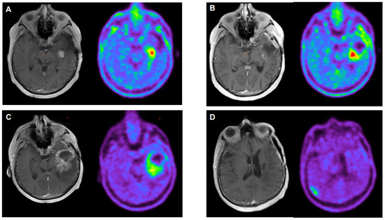 - Ceccon, G.; Lohmann, P.; Werner, J.M.; Tscherpel, C.; Dunkl, V.; Stoffels, G.; Rosen, J.; Rapp, M.; Sabel, M.; Herrlinger, U.; et al. Early treatment response assessment using 18F-FET PET compared with contrast-enhanced MRI in glioma patients after adjuvant temozolomide chemotherapy. J. Nucl. Med. 2021, 62, 918–925. [Google Scholar] [CrossRef] [PubMed]