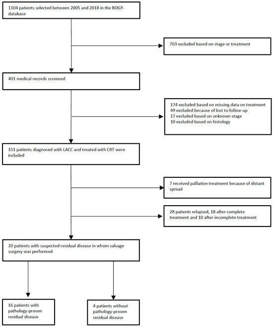 Between January 2005 and December 2018, 1104 patients with cervical cancer were identified in the ROGY database. Of these, 703 patients were excluded because they were diagnosed with early-stage cervical cancer and/or received a treatment other than CRT. Medical records of 401 patients with locally advanced cervical cancer were screened, and 174 patients were excluded because of missing data on treatment, 49 because of loss to follow-up, 17 because of unknown FIGO stage, and 10 because of different histological subtypes. In total, 151 patients met the inclusion criteria (Figure 1).