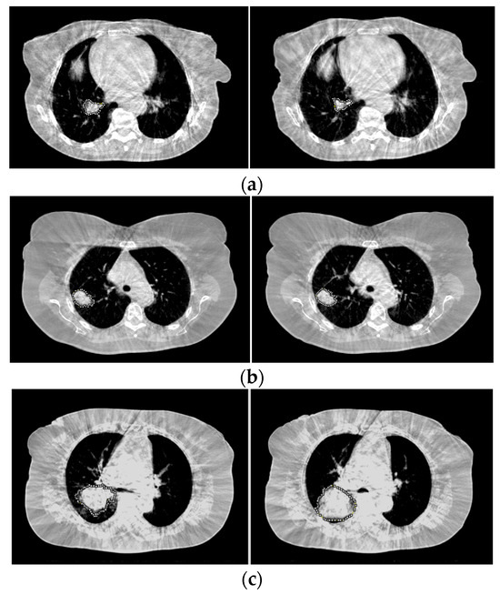 Keywords: tumor response assessment; stereotactic radiation therapy (SBRT); cone-beam computerized tomography (CBCT); tumor area; tumor linear attenuation coefficient (μ); tumor contrast-to-noise ratio (CNR) tumor response assessment; stereotactic radiation therapy (SBRT); cone-beam computerized tomography (CBCT); tumor area; tumor linear attenuation coefficient (μ); tumor contrast-to-noise ratio (CNR)