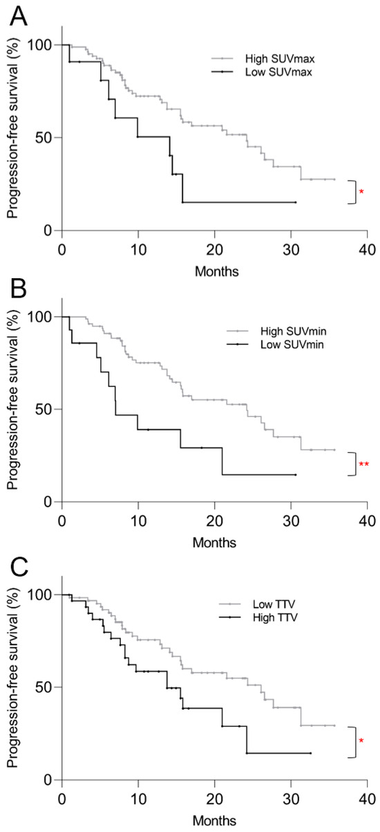 The Kaplan–Meier survival analysis revealed significantly shorter PFS in the low SUVmax group compared to the high SUVmax group, with median of 14.1 vs. 24.2 months, respectively (p = 0.032, Figure 3A). Significantly shorter PFS was also found in the low SUVmin group (7.0 vs. 24.2 mo, p = 0.006) and high TTV group (13.8 vs. 26.1 mo, p = 0.034), as shown on Figure 3B,C. On univariate Cox regression analysis, low SUVmax (p = 0.037), low SUVmin (p = 0.008), and high TTV (p = 0.037) were predictive of shorter PFS (Table 2). On multivariate analysis, low SUVmin (p = 0.030) and high TTV (p = 0.007) remained predictive of shorter PFS.