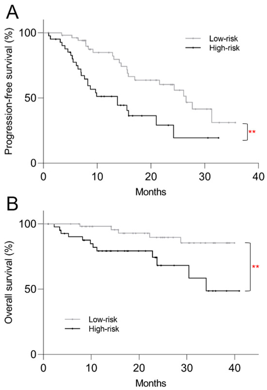 Kaplan–Meier plots of post-PRRT survival based on high vs. low-risk stratification using pre-treatment 68Ga-DOTATATE PET/CT. High-risk patients showed significantly shorter (A) progression-free survival (p = 0.001) and (B) overall survival (p = 0.006). ** p < 0.01.