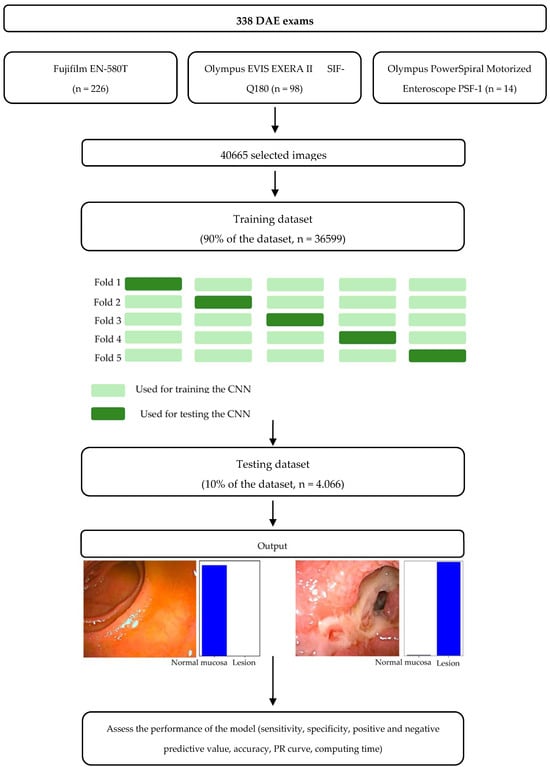 In recent years, the application of artificial intelligence (AI) technologies in the medical field has observed exponential growth. Convolutional neural networks (CNNs) are a human cortex-inspired multi-layer architecture, with high proficiency for image pattern detection [11]. As a matter of fact, CNN models have been developed in several medical areas [12,13,14]. CE has been a focus of study in the development and application of deep learning technologies, increasing its diagnostic yield with a significant reading time reduction [15,16,17]. In fact, the development of deep learning methods has been theorized as a potential revolutionary tool to increase the diagnostic accuracy and cost-effectiveness of DAE [10]. Nevertheless, the implementation of AI models for DAE is still in the early stages. In fact, AI application in DAE has been studied for the identification of vascular lesions, protuberant lesions, ulcers and erosions [18,19,20]. Nevertheless, the clinical application of such technology is dependent on the ability to identify different types of lesions throughout a complete exam, while functioning in different devices. In this study, our group aimed to develop the first worldwide multibrand CNN for panendoscopic automatic classification of clinically relevant lesions in DAE, namely, vascular lesions, hematic residues, protuberant lesions, ulcers and erosions.