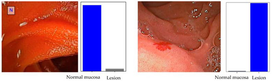 The binary CNN calculated the probability of normal mucosa versus clinically relevant lesions for each given image (Figure 2), with higher probabilities demonstrating greater CNN prediction confidence. Heatmaps were generated based on localized features responsible for the prediction of the model (Figure 3), attempting to achieve a better comprehension of the model and guide clinical decision either during tissue sampling or therapeutic procedures. The CNN’s classification was compared to three DAE experts’, which remains the gold standard for evaluation of DAE images. Table 1 translates the confusion matrix between experts and CNN classification.