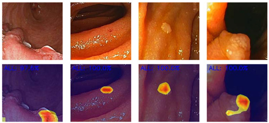 Heatmaps generated by the convolutional neural network selecting the image location responsible for the identification of clinically relevant panendoscopic lesions. The given probability represents the level of certainty in lesion prediction.