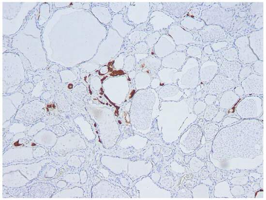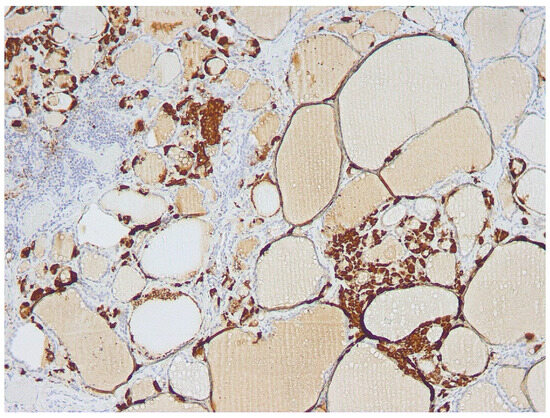- Verga, U.; Ferrero, S.; Vicentini, L.; Brambilla, T.; Cirello, V.; Muzza, M.; Beck-Peccoz, P.; Fugazzola, L. Histopathological and molecular studies in patients with goiter and hypercalcitoninemia: Reactive or neoplastic C-cell hyperplasia? Endocr. Relat. Cancer 2007, 14, 393–403. [Google Scholar] [CrossRef]