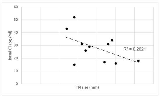 Correlation between basal CT and TN size in the study group with CCH. CT, calcitonin; TN, thyroid nodules.