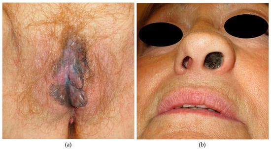 - Tcheung, W.J.; Selim, M.A.; Herndon, J.E.; Abernethy, A.P.; Nelson, K.C. Clinicopathologic study of 85 cases of melanoma of the female genitalia. J. Am. Acad. Dermatol. 2012, 67, 598–605. [Google Scholar] [CrossRef]