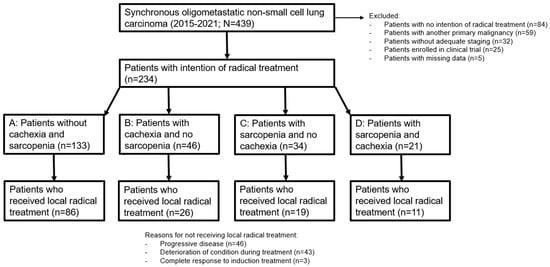 The following baseline characteristics were collected from the digital medical files: age, gender, World Health Organization performance status (WHO-PS), weight at diagnosis, weight loss in the last 6 months before diagnosis, length, smoking status and pack years, data on histology, biochemical data within 30 days before the start of treatment or at the date of the first pathological confirmed NSCLC diagnosis, molecular and programmed death-ligand 1 (PD-L1) testing, TNM stage based on the eighth edition of the American Joint Committee on Cancer (AJCC) including the number and location of metastases, the decision of the MDT whether the patient was classified as oligometastatic NSCLC, whether LRT was recommended, and information on first-line systemic therapy. Response after finishing treatment was established according to Response Evaluation Criteria in Solid Tumors 1.1 (RECIST 1.1) []. Further data collected were: whether patients actually received LRT, treatment toxicity as documented in the medical files, graded according to the Common Terminology Criteria for Adverse Events (CTCAE version 5.0), date of disease progression, subsequent treatment strategies, and date of last contact/death. The regular definition of cachexia was used: cachexia was defined as an involuntary loss of more than 5% body weight in the past six months or more than 2% body weight loss in patients with a body mass index (BMI) ≤ 20 kg/m2 [].