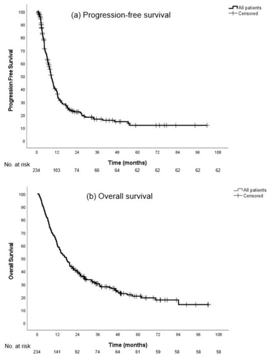 Progression-free survival (a) and overall survival (b) in all patients.