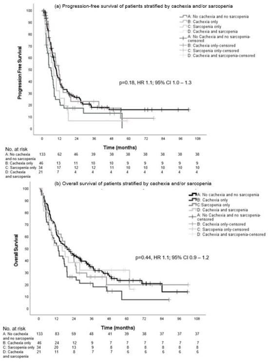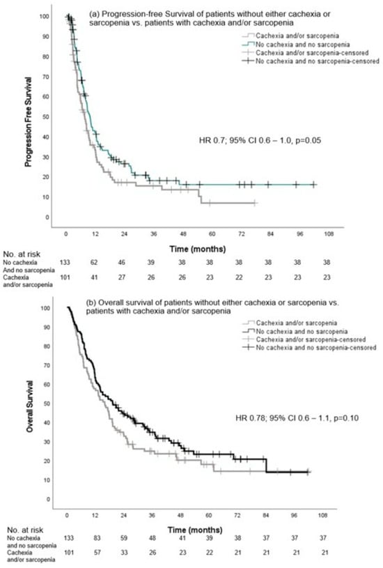 Progression-free survival and overall survival of patients without either cachexia or sarcopenia vs. patients with cachexia and/or sarcopenia.