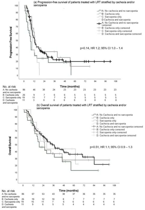 Progression-free survival (a) and overall survival (b) in patients with intention of LRT stratified by cachexia and/or sarcopenia.