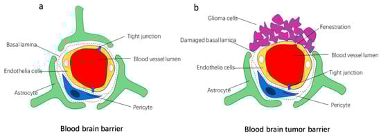 Differences in structure between the BBB (a) and BTB (b). The BBB consists of a monolayer of non-fenestrated endothelial cells connected by tight junctions. It involves interaction with astrocyte foot processes and pericytes, along with the presence of a functional basement membrane. As the tumor progresses, invasive cells provoke architectural changes in the normal brain vasculature, resulting in fenestrated endothelial cells, disrupted basement membrane (basal lamina), and unattached astrocytes and pericytes. The BTB is also characterized by increased pinocytic activity. Reused from Qiu et al. [48].