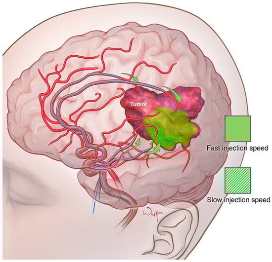 Considering the highly variable vascularity of glioblastoma and the fact that it may be impossible to precisely locate the exact vascular supply of GBM with conventional angiography, Chen et al. recommended merging preoperative anatomic MRI images with real-time perfusion images from super-selective injection during angiography (Figure 6) [111]. The authors could accurately locate the vascular supply to brain tumors and facilitate subsequent catheter delivery of the therapeutic agent [111]. This promising method of improving the precision of IA delivery and subsequently verifying that the perfused territory overlaps the tumor volume will be further evaluated in an ongoing clinical trial (NCT03896568) [111].