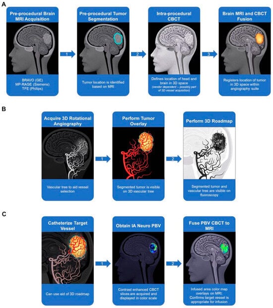 Demonstrates the perfusion-guided endovascular super-selective intra-arterial infusion workflow proposed by Chen et al.: (A) Alignment of patient position with MRI. (B) Three-dimensional (3D) overlay for vessel selection. (C) Integration of parenchymal blood volume (PBV) with MRI. Reused with permission from Chen et al. [111].