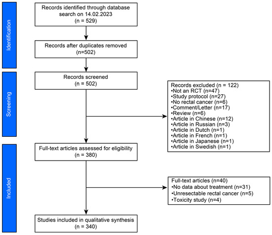 The excluded articles were non-RCTs, literature reviews, observational epidemiological studies (cohort and case-control designs), case series, case reports, articles describing other forms of rectal cancer treatment without radiotherapy in the treatment regimen, and studies including cancers other than rectal cancer and articles are written in a language different than the above mentioned. All duplicate articles were removed, and database limits were utilised to exclude paediatric and anatomical/cadaver articles.