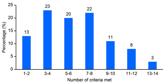 Of the 14 criteria related to the completeness of reporting of surgical outcomes and complication data, only seven articles (2%) [61,70,114,122,123,124,125] met all the criteria (Figure 2). Four articles (<1.0%) [71,126,127,128] met 13 criteria, and 27 articles (8%) met either 11 or 12 criteria. Additionally, 36 articles (11%) met from 9 to 10 criteria, 76 (22%) met from 7 to 8 criteria, 68 (20%) met from 5 to 6 criteria, 79 (23%) met from 3 to 4 criteria, and 43 (13%) met from 1 to 2 criteria. A mean of 6.1 ± 3.1 (SD) criteria and a median of 5.5 (IQR 5) were met. There was a linear trend in the quality of the articles, as reflected by the mean criteria met, over time (Supplementary Figure S1).