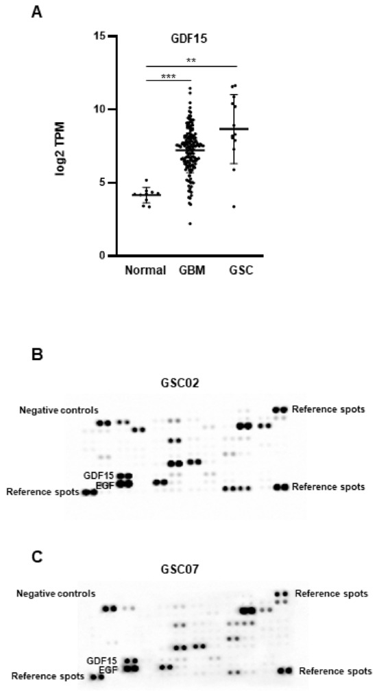 GDF15 expression in normal tissue, GBM, and GSCs. (A) The expression of GDF15 mRNA in normal tissue or GBM samples from the TCGA database was compared with the RNAseq data of GSCs derived from 13 human GBM biopsy specimens. The data were normalized with GAPDH expression. Pairwise t-tests were performed between the groups. Results are presented as means ± SD of log2 TPM. *** p < 0.001; ** 0.001 < p < 0.01. (B,C) GDF15 secretion by GSCs (GSC02, GSC07) was analyzed using the R&D Human XL Cytokine Array kit on 48 h conditioned media as described in “Methods”. EGF, which is added to the stem cell culture medium, can serve as a positive control. Images are representative of three independent experiments.