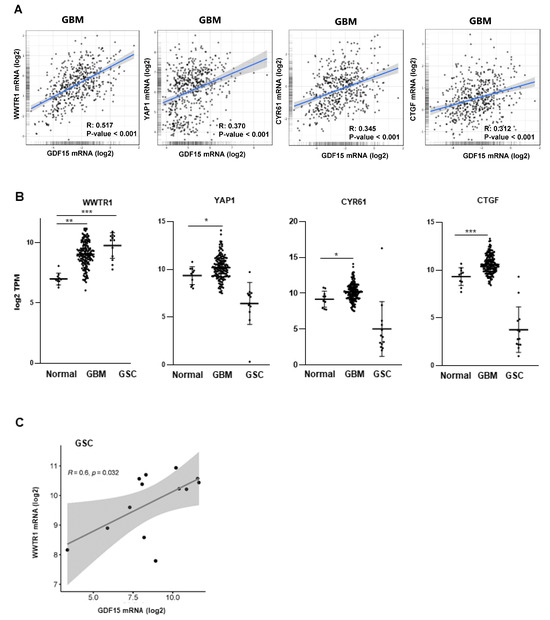 Correlations between the expression of GDF15 and the Hippo pathway genes. (A) The correlations between GDF15 expression and, respectively, WWTR1/TAZ, YAP1, CYR61, and CTGF were obtained by the co-expression analysis in Gliovis as described in “Methods” using the TGCA database. Values correspond to the Spearman correlation coefficient (R) and its associated p-value. (B) The expression of WWTR1/TAZ, YAP1, Cyr61, and CTGF mRNA in normal tissue or GBM samples from the TCGA database was compared with the RNAseq data of GSCs derived from 13 human GBM biopsy specimens. The data were normalized with GAPDH expression. Pairwise t-tests were performed between the groups. Results are presented as means ± SD of log2 TPM. *** p < 0.001; ** 0.001 < p < 0.01; * 0.01 < p < 0.05. (C) The correlation curve between GDF15 and WWTR1/TAZ in GSCs was performed with Srplot as described in “Methods” using the RNAseq data. The values correspond to the Spearman correlation coefficient (R) and its associated p-value.
