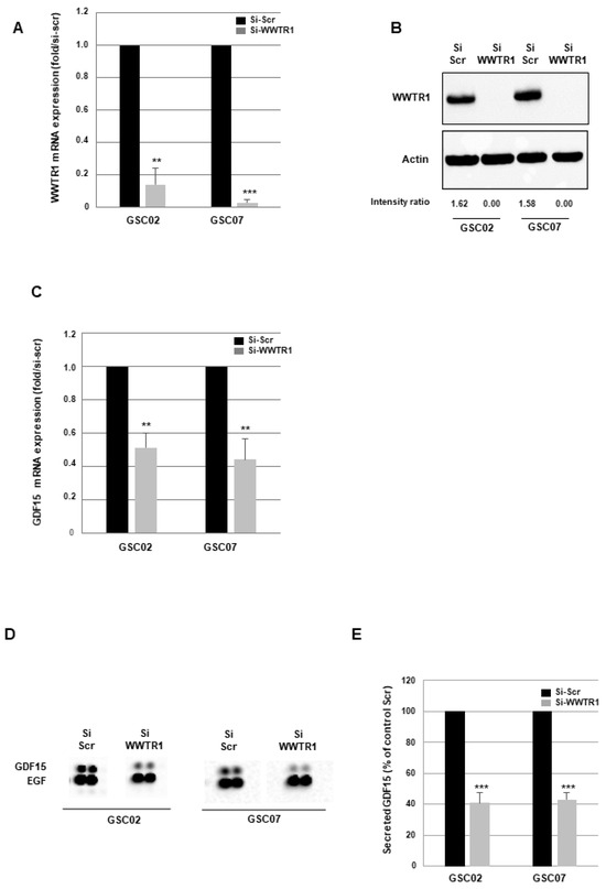 3.2. GDF15 Expression Is Regulated by the Transcription Factor WWTR1/TAZ in GSCs