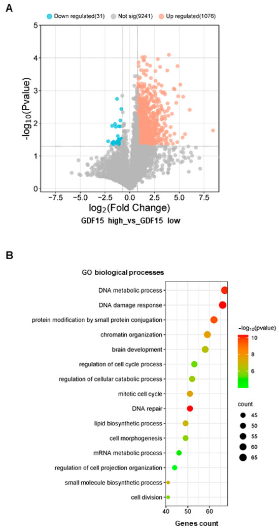 Genes and pathways associated with GDF15 high expression in GSCs. (A) Volcano plot showing the genes that are differentially expressed between GSCs with a strong expression of GDF15 (GDF15 high) compared with GSCs expressing GDF15 weakly (GDF15 low), performed as described in “Methods”. (B) Gene ontology analysis (biological processes) was performed on the genes significantly up-regulated in the high expressing GDF15 GSCs as described in “Methods”.